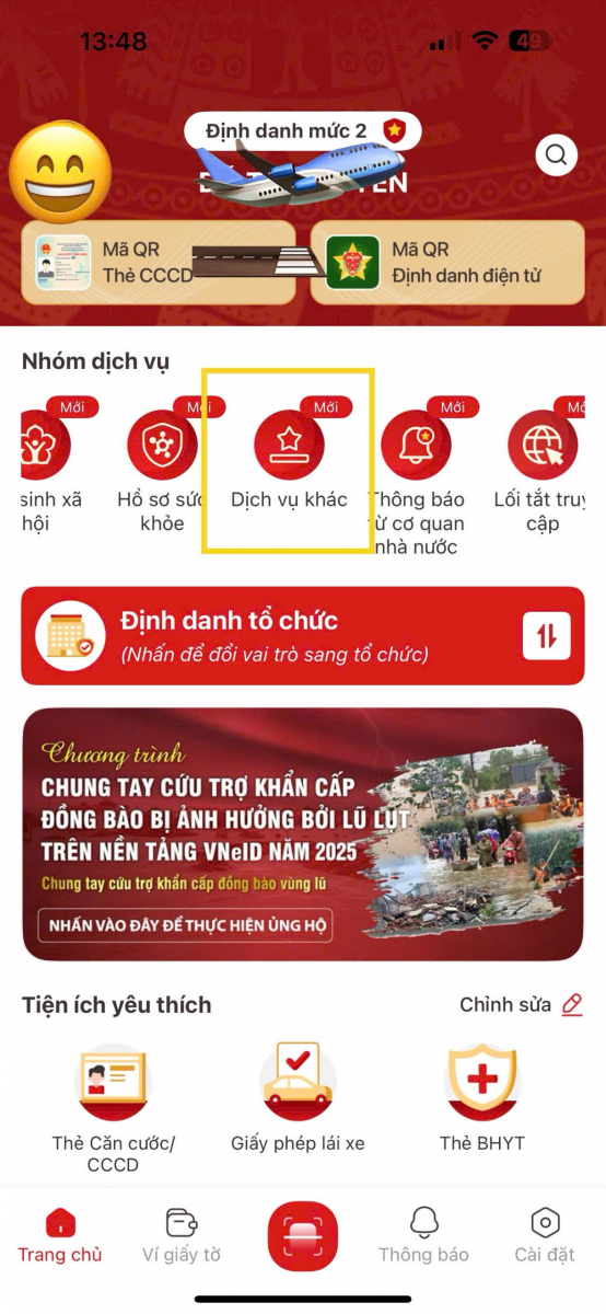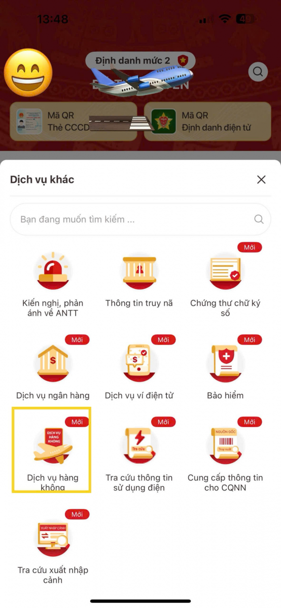 Bước 1: Hành khách đăng nhập ứng dụng VNeID với tài khoản đã được định danh mức 2.