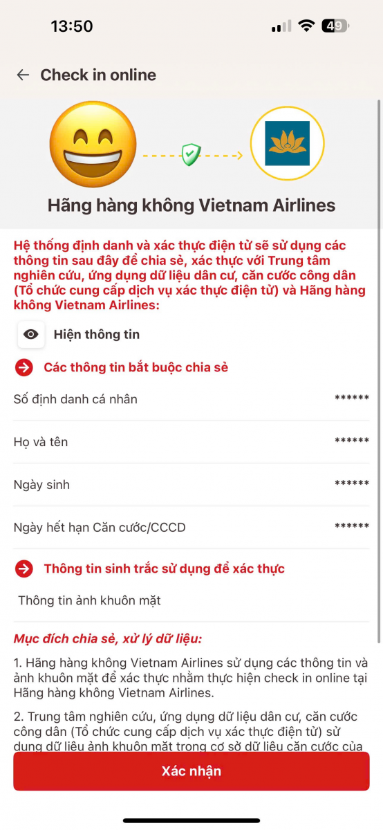 Bước 5: Sau khi xác nhận đồng ý về quy định, mục đích chia sẻ, xử lý dữ liệu, hành khách được chuyển hướng sang ứng dụng của Hãng hàng không để hoàn thiện quá trình làm thủ tục trực tuyến và xác thực danh tính (eKYC).