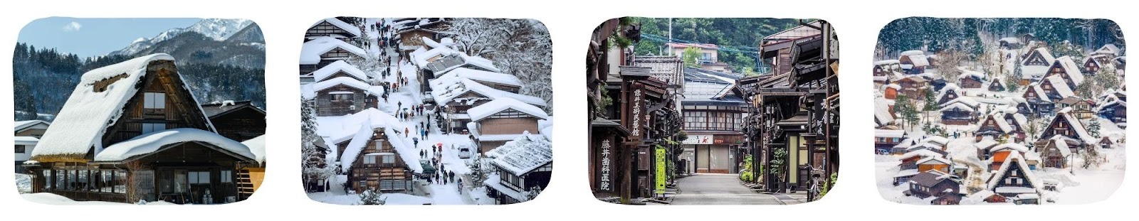 - Làng cổ Shirakawa-go: Làng cổ Shirakawago nằm trong TOP các ngôi làng cổ xưa nhất Nhật Bản, nơi đây được UNESCO công nhận là Di sản văn hóa thế giới vào năm 1995 với kiến trúc Gassho Zukuri độc đáo có lịch sử lên đến 300 năm. Mùa đông ở làng cổ Shirakawa-go tựa như bức tranh thần thoại khi tuyết trắng tinh khôi phủ kín những mái nhà gassho-zukuri cổ kính. Khung cảnh tĩnh lặng giữa núi đồi phủ tuyết khiến du khách như lạc vào một nơi thời gian ngừng trôi và thiên nhiên giữ trọn vẻ đẹp hoang sơ.