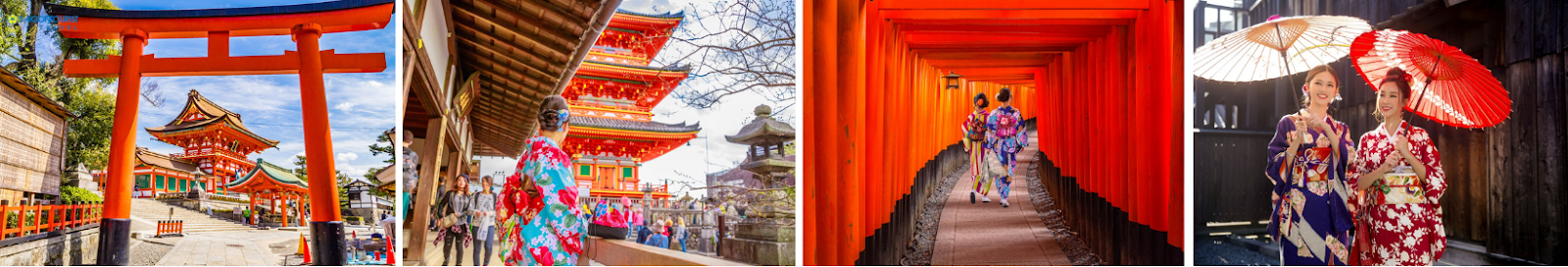 - Đền Fushimi Inari (đền 1000 cột) thờ phụng Inari – vị thần phù hộ cho mùa màng bội thu và kinh doanh phát đạt. Con đường với những cánh cổng Torii màu cam rực rỡ dường như vô tận chạy dọc lên núi Inari tạo nên một khung cảnh ấn tượng và là một trong những hình ảnh nổi tiếng nhật Nhật Bản.